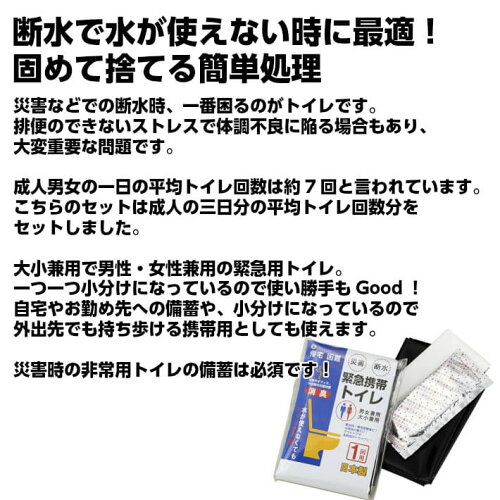 商品説明材質 トイレ(ポリエチレン・高分子ポリマー・ウッドパウダー)ライト(ABS樹脂)セット内容緊急用トイレ×21個COB伸縮2WAYライト×1ウェットティッシュ×3商品説明 ・緊急用トイレ断水で水が使えない時に最適!固めて捨てる簡単処理! 災害などでの断水時、一番困るのがトイレです。